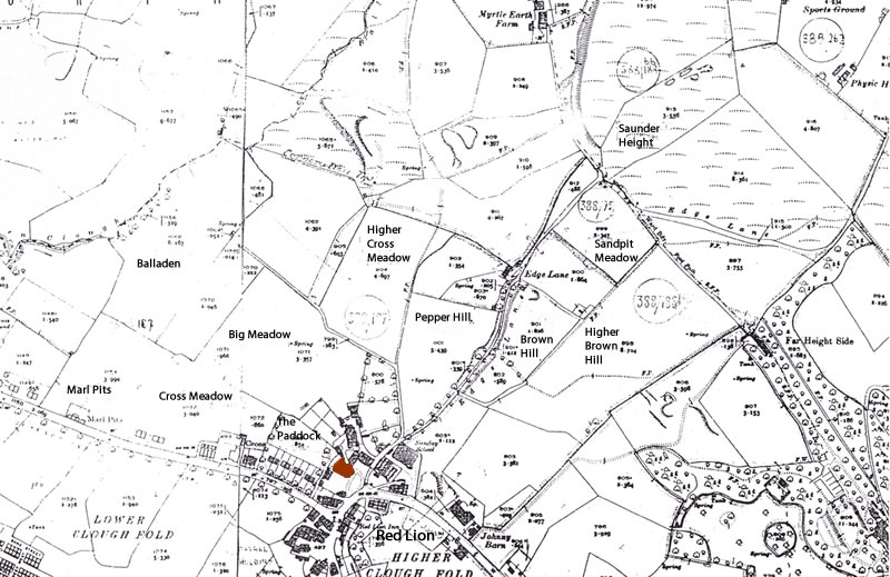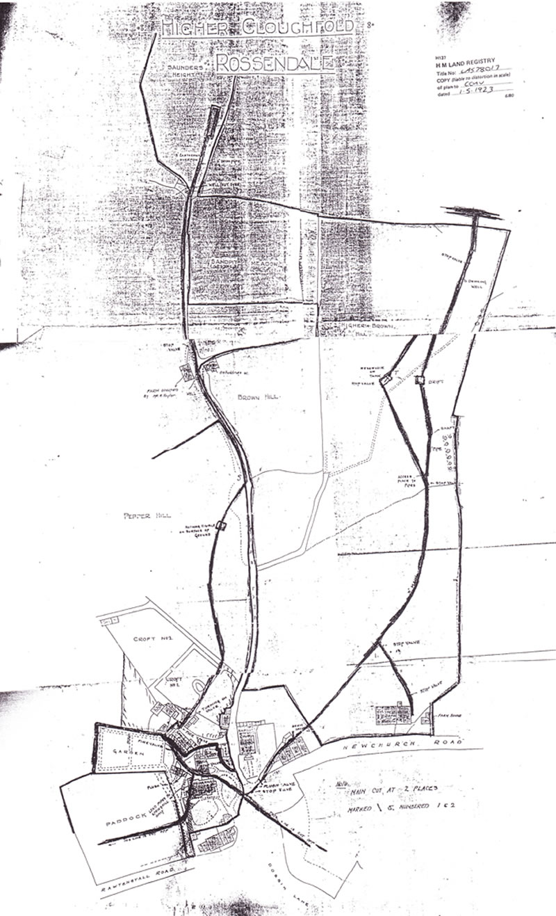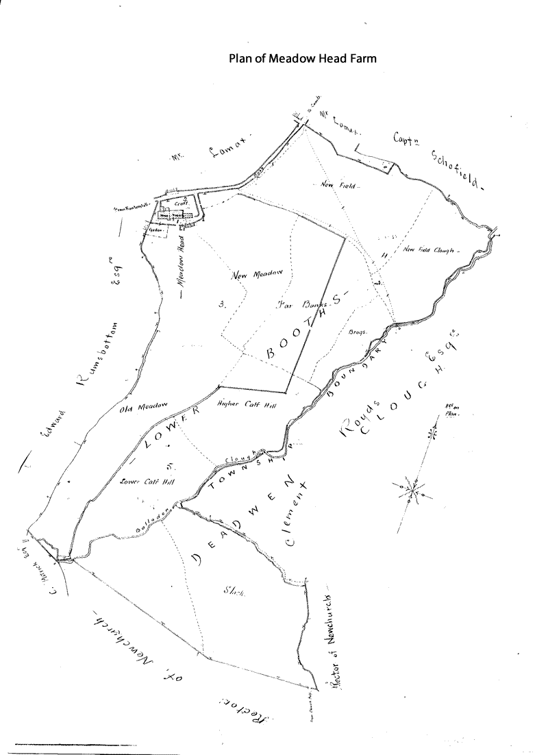 Having said that, it is clear that they owned a number of properties in the Higher Cloughfold, Edgeside and Lumb areas. In Higher Cloughfold these included Springhill farm and lands and the rest of the Springhill properties. It also included the Red Lion pub, Plantation House (on Dobbin Lane, rented to Sion Baptist as a manse), Saunder Height (top of Edge Lane) and the land on which Marl Pits Sports Centre now stands. Some of the fields are labelled on the fields map (the map itself is later and the houses south of the Paddock were not present in Patrick's time). The plan of Meadow Head Farm shows how Patrick's land related to that of other landowners at the time.